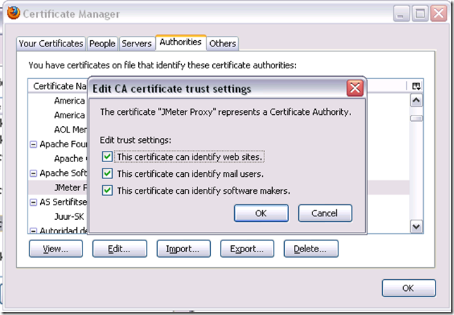 I had looked into this on google, but couldn't find a source to tell how this can be done. But my colleague found out that there is a file in extras directory of Jmeter.. Its called proxycert.cmd(sh for linux) . Import this file firefox by clicking on Options->Advanced –>View certificates>Authorities –> Import. After this you will see the Jmeter Proxy certificate as shown below